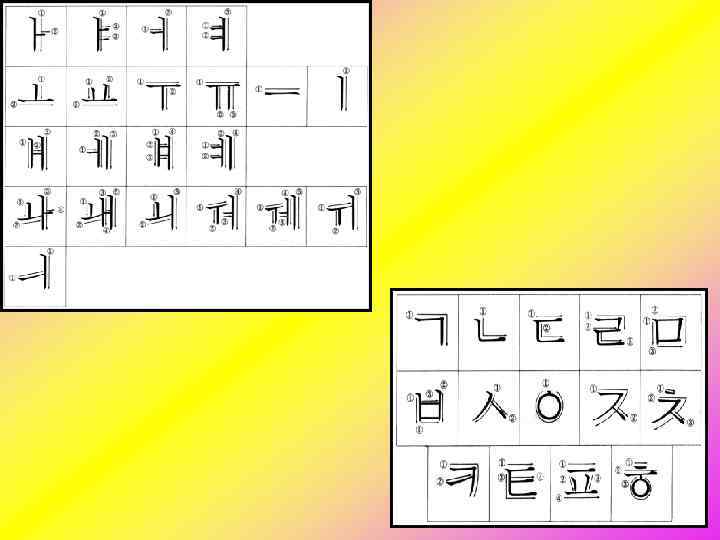 Курс корейского языка - Алфавит [1 урок] • Современный корейский алфавит состоит из 40 букв 24 основных и 16 составных. Из них 19 согласные буквы и 21 гласные. В корейском языке существует 14 простых и 5 составных букв для обозначения согласных звуков. Среди гласных букв в корейском языке выделяют 10 простых и 11 составных. Итого: Согласных 19 (14 основных и 5 составных). Гласных 21 (10 основных и 11 дифтонгов).