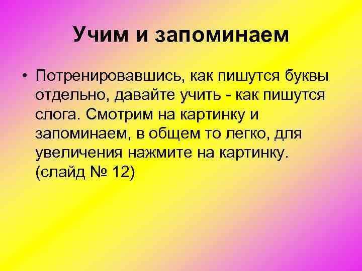 Учим и запоминаем • Потренировавшись, как пишутся буквы отдельно, давайте учить как пишутся слога. Смотрим на картинку и запоминаем, в общем то легко, для увеличения нажмите на картинку. (слайд № 12)