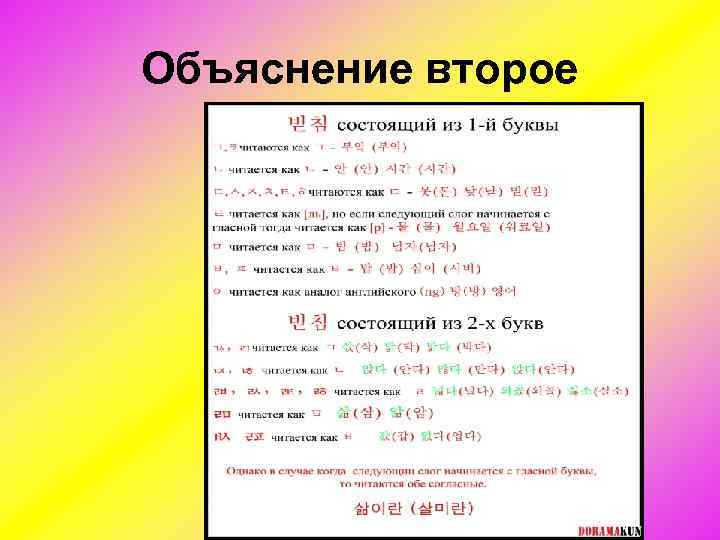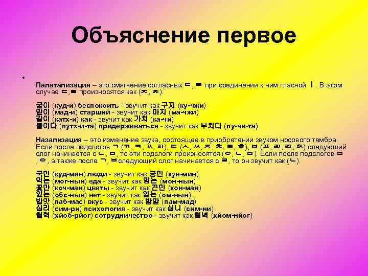 Объяснение первое • Палатализация – это смягчение согласных ㄷ, ㅌ при соединении к ним гласной ㅣ. В этом случае ㄷ, ㅌ произносятся как (ㅈ, ㅊ). 굳이 (куд-и) беспокоить звучит как 구지 (ку-чжи) 맏이 (мад-и) старший звучит как 마지 (ма-чжи) 같이 (катх-и) как звучит как 가치 (ка-чи) 붙이다 (путх-и-та) придерживаться звучит как 부치다 (пу-чи-та) Назализация – это изменение звука, состоящее в приобретении звуком носового тембра. Если после подслогов ㄱ (ㄲ, ㅋ, ㄳ, ㄺ), ㄷ (ㅅ, ㅆ, ㅈ, ㅊ, ㅌ, ㅎ), ㅂ (ㅍ, ㄼ, ㄿ, ㅄ) следующий слог начинается с ㄴ, ㅁ, то эти подслоги произносятся (ㅇ, ㄴ, ㅁ). Если после подслогов ㅁ , ㅇ, а также после ㄱ, ㅂследующий слог начинается с ㄹ, то он звучит как (ㄴ). 국민 (куд-мин) люди звучит как 궁민 (кун-мин) 먹는 (мог-нын) еда звучит как 멍는 (мон-нын) 꽃만 (коч-ман) цветы звучит как 꼰만 (кон-ман) 없는 (обс-нын) нет звучит как 엄는 (ом-нын) 밥맛 (паб-мас) вкус звучит как 밤맏 (пам-мад) 심리 (сим-ри) психология звучит как 심니 (сим-ни) 협력 (хйоб-рйог) сотрудничество звучит как 혐녁 (хйом-нйог)