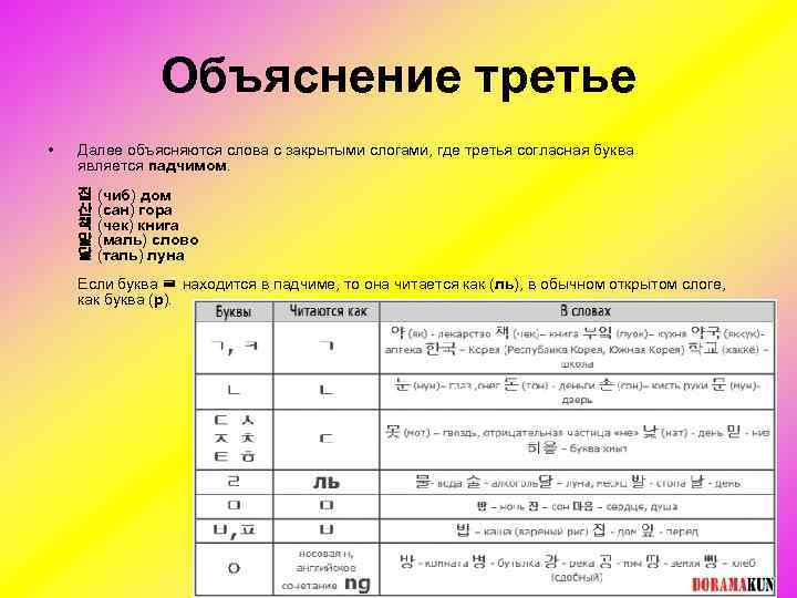 Объяснение третье • Далее объясняются слова с закрытыми слогами, где третья согласная буква является падчимом. 집 (чиб) дом 산 (сан) гора 책 (чек) книга 말 (маль) слово 달 (таль) луна Если буква ㄹ находится в падчиме, то она читается как (ль), в обычном открытом слоге, как буква (р).