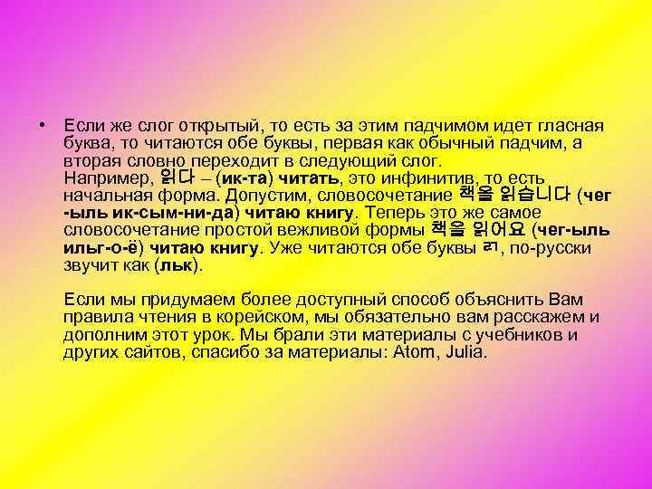 • Если же слог открытый, то есть за этим падчимом идет гласная буква, то читаются обе буквы, первая как обычный падчим, а вторая словно переходит в следующий слог. Например, 읽다 – (ик-та) читать, это инфинитив, то есть начальная форма. Допустим, словосочетание 책을 읽습니다 (чег -ыль ик-сым-ни-да) читаю книгу. Теперь это же самое словосочетание простой вежливой формы 책을 읽어요 (чег-ыль ильг-о-ё) читаю книгу. Уже читаются обе буквы ㄺ, по русски звучит как (льк). Если мы придумаем более доступный способ объяснить Вам правила чтения в корейском, мы обязательно вам расскажем и дополним этот урок. Мы брали эти материалы с учебников и других сайтов, спасибо за материалы: Atom, Julia.