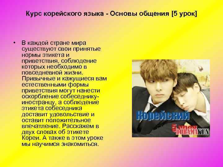 Курс корейского языка - Основы общения [5 урок] • В каждой стране мира существуют свои принятые нормы этикета и приветствия, соблюдение которых необходимо в повседневной жизни. Привычные и кажущиеся вам естественными формы приветствия могут нанести оскорбление собеседнику иностранцу, а соблюдение этикета собеседника доставит удовольствие и оставит положительное впечатление. Расскажем в двух словах об этикете Кореи. А также в этом уроке мы научимся знакомиться.