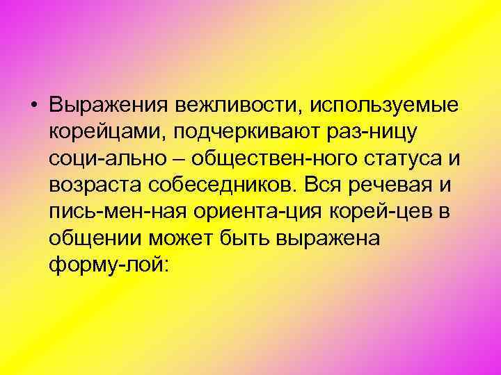 • Выражения вежливости, используемые корейцами, подчеркивают раз ницу соци ально – обществен ного статуса и возраста собеседников. Вся речевая и пись мен ная ориента ция корей цев в общении может быть выражена форму лой: