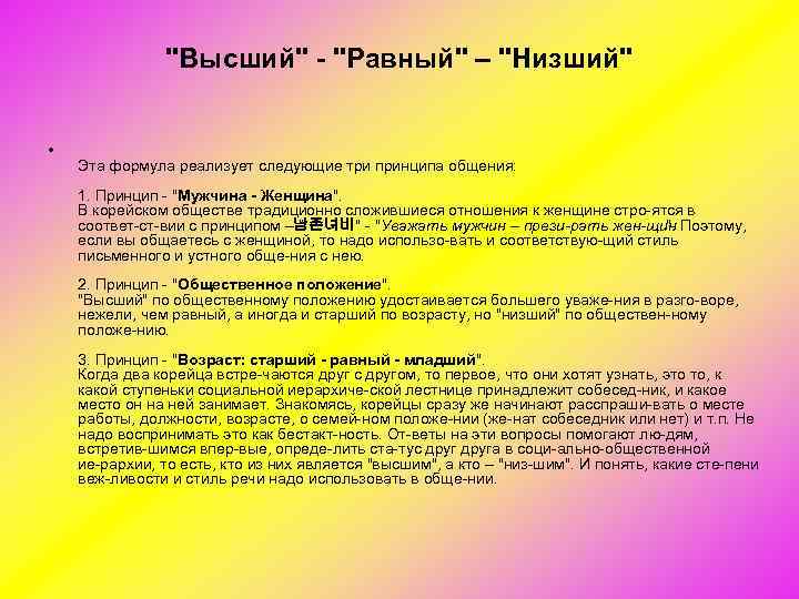"Высший" - "Равный" – "Низший" • Эта формула реализует следующие три принципа общения: 1. Принцип "Мужчина - Женщина". В корейском обществе традиционно сложившиеся отношения к женщине стро ятся в соответ ст вии с принципом – " 남존녀비" "Уважать мужчин – прези рать жен щин ". Поэтому, если вы общаетесь с женщиной, то надо использо вать и соответствую щий стиль письменного и устного обще ния с нею. 2. Принцип "Общественное положение". "Высший" по общественному положению удостаивается большего уваже ния в разго воре, нежели, чем равный, а иногда и старший по возрасту, но "низший" по обществен ному положе нию. 3. Принцип "Возраст: старший - равный - младший". Когда два корейца встре чаются друг с другом, то первое, что они хотят узнать, это то, к какой ступеньки социальной иерархиче ской лестнице принадлежит собесед ник, и какое место он на ней занимает. Знакомясь, корейцы сразу же начинают расспраши вать о месте работы, должности, возрасте, о семей ном положе нии (же нат собеседник или нет) и т. п. Не надо воспринимать это как бестакт ность. От веты на эти вопросы помогают лю дям, встретив шимся впер вые, опреде лить ста тус друга в соци ально общественной ие рархии, то есть, кто из них является "высшим", а кто – "низ шим". И понять, какие сте пени веж ливости и стиль речи надо использовать в обще нии.