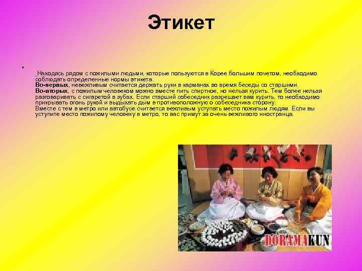 Этикет • Находясь рядом с пожилыми людьми, которые пользуются в Корее большим почетом, необходимо соблюдать определенные нормы этикета. Во-первых, невежливым считается держать руки в карманах во время беседы со старшими. Во-вторых, с пожилым человеком можно вместе пить спиртное, но нельзя курить. Тем более нельзя разговаривать с сигаретой в зубах. Если старший собеседник разрешает вам курить, то необходимо прикрывать огонь рукой и выдыхать дым в противоположную о собеседника сторону. Вместе с тем в метро или автобусе считается вежливым уступать место пожилым людям. Если вы уступите место пожилому человеку в метро, то вас примут за очень вежливого иностранца.