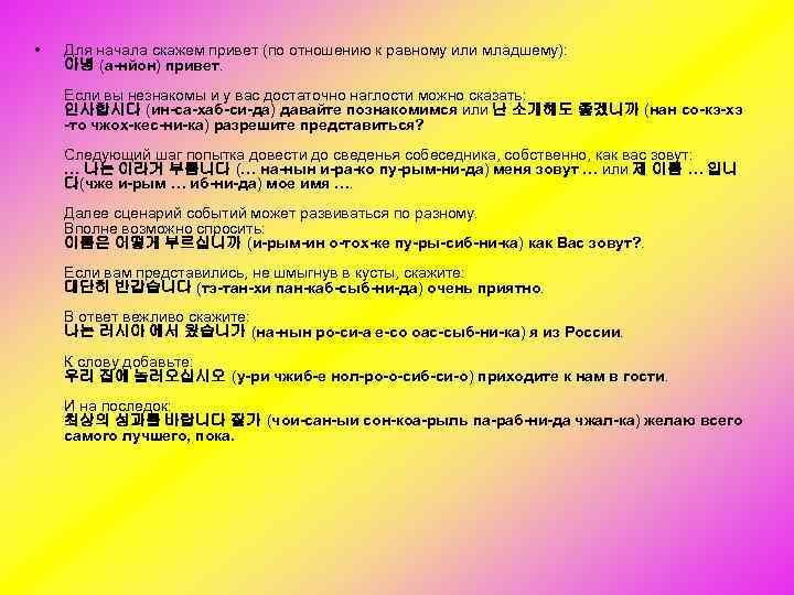 • Для начала скажем привет (по отношению к равному или младшему): 아녕 (а-нйон) привет. Если вы незнакомы и у вас достаточно наглости можно сказать: 인사합시다 (ин-са-хаб-си-да) давайте познакомимся или 난 소개해도 좋겠니까 (нан со-кэ-хэ -то чжох-кес-ни-ка) разрешите представиться? Следующий шаг попытка довести до сведенья собеседника, собственно, как вас зовут: … 나는 이라거 부름니다 (… на-нын и-ра-ко пу-рым-ни-да) меня зовут … или 제 이름 … 입니 다(чже и-рым … иб-ни-да) мое имя …. Далее сценарий событий может развиваться по разному. Вполне возможно спросить: 이름은 어떻게 부르십니까 (и-рым-ин о-тох-ке пу-ры-сиб-ни-ка) как Вас зовут? . Если вам представились, не шмыгнув в кусты, скажите: 대단히 반갑습니다 (тэ-тан-хи пан-каб-сыб-ни-да) очень приятно. В ответ вежливо скажите: 나는 러시아 에서 왔습니가 (на-нын ро-си-а е-со оас-сыб-ни-ка) я из России. К слову добавьте: 우리 집에 놀러오십시오 (у-ри чжиб-е нол-ро-о-сиб-си-о) приходите к нам в гости. И на последок: 최상의 성과를 바랍니다 잘가 (чои-сан-ыи сон-коа-рыль па-раб-ни-да чжал-ка) желаю всего самого лучшего, пока.