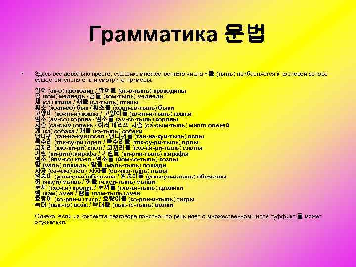 Грамматика 문법 • Здесь все довольно просто, суффикс множественного числа ~들 (тыль) прибавляется к корневой основе существительного или смотрите примеры. 악어 (ак-о) крокодил / 악어들 (ак-о-тыль) крокодилы 곰 (ком) медведь / 곰들 (ком-тыль) медведи 새 (сэ) птица / 새들 (сэ-тыль) птицы 황소 (хоан-со) бык / 황소들 (хоан-со-тыль) быки 고양이 (ко-ян-и) кошка / 고양이들 (ко-ян-и-тыль) кошки 암소 (ам-со) корова / 암소들 (ам-со-тыль) коровы 사슴 (са-сым) олень / 여러 마리의 사슴 (са-сым-тыль) много оленей 개 (кэ) собака / 개들 (кэ-тыль) собаки 당나귀 (тан-на-куи) осел / 당나귀들 (тан-на-куи-тыль) ослы 독수리 (ток-су-ри) орел / 독수리들 (ток-су-ри-тыль) орлы 코끼리 (кхо-ки-ри) слон / 코끼리들 (кхо-ки-ри-тыль) слоны 기린 (ки-рин) жирафа / 기린들 (ки-рин-тыль) жирафы 염소 (йом-со) козел / 염소들 (йом-со-тыль) козлы 말 (маль) лошадь / 말들 (маль-тыль) лошади 사자 (са-чжа) лев / 사자들 (са-чжа-тыль) львы 원숭이 (уон-сун-и) обезьяна / 원숭이들 (уон-сун-и-тыль) обезьяны 쥐 (чжуи) мышь / 쥐들 (чжуи-тыль) мыши 토끼 (тхо-ки) кролик / 토끼들 (тхо-ки-тыль) кролики 뱀 (пэм) змея / 뱀들 (пэм-тыль) змеи 호랑이 (хо-рон-и) тигр / 호랑이들 (хо-рон-и-тыль) тигры 늑대 (нык-тэ) волк / 늑대들 (нык-тэ-тыль) волки Однако, если из контекста разговора понятно что речь идет о множественном числе суффикс 들 может опускаться.