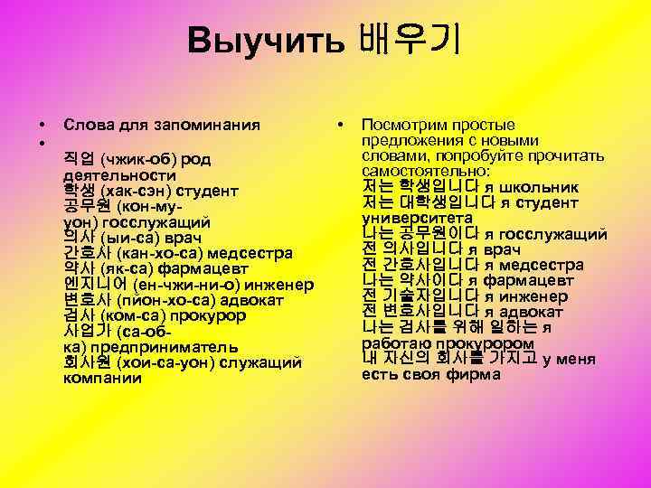 Выучить 배우기 • • Слова для запоминания 직업 (чжик-об) род деятельности 학생 (хак-сэн) студент 공무원 (кон-мууон) госслужащий 의사 (ыи-са) врач 간호사 (кан-хо-са) медсестра 약사 (як-са) фармацевт 엔지니어 (ен-чжи-ни-о) инженер 변호사 (пйон-хо-са) адвокат 검사 (ком-са) прокурор 사업가 (са-обка) предприниматель 회사원 (хои-са-уон) служащий компании • Посмотрим простые предложения с новыми словами, попробуйте прочитать самостоятельно: 저는 학생입니다 я школьник 저는 대학생입니다 я студент университета 나는 공무원이다 я госслужащий 전 의사입니다 я врач 전 간호사입니다 я медсестра 나는 약사이다 я фармацевт 전 기술자입니다 я инженер 전 변호사입니다 я адвокат 나는 검사를 위해 일하는 я работаю прокурором 내 자신의 회사를 가지고 у меня есть своя фирма
