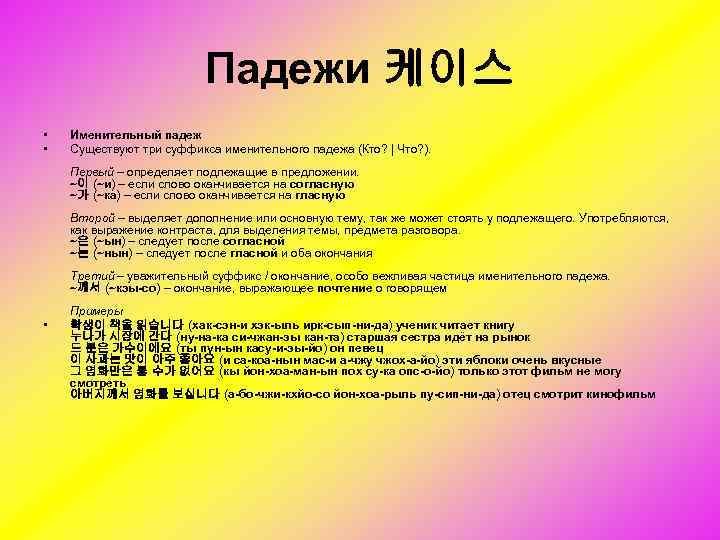Курс корейского языка - Падежи. Часть 1 [7 урок] • • Вспоминаем уроки русского языка. Количество, да и название, падежей в корейском языке значительно отличается от русского. Склонение включает 9 простых падежей: основной (инфинитив), именительный, родительный, винительный, дательный, местный, творительный, совместный, звател ьный и множество так называемых составных (2 3 суффикса) падежей. В разговорном языке многие падежи могут сокращаться или опускаться.
