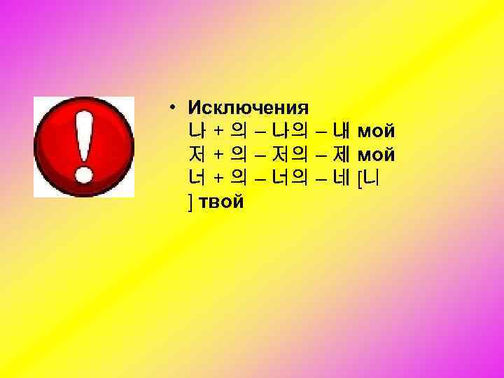 • Исключения 나 + 의 – 나의 – 내 мой 저 + 의 – 저의 – 제 мой 너 + 의 – 너의 – 네 [니 ] твой