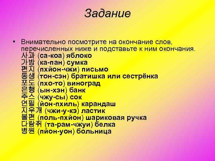 Задание • Внимательно посмотрите на окончание слов, перечисленных ниже и подставьте к ним окончания. 사과 (са-коа) яблоко 가방 (ка-пан) сумка 편지 (пхйон-чжи) письмо 동생 (тон-сэн) братишка или сестрёнка 포도 (пхо-то) виноград 은행 (ын-хэн) банк 주스 (чжу-сы) сок 연필 (йон-пхиль) карандаш 지우개 (чжи-у-кэ) ластик 볼편 (поль-пхйон) шариковая ручка 다람쥐 (та-рам-чжуи) белка 병원 (пйон-уон) больница