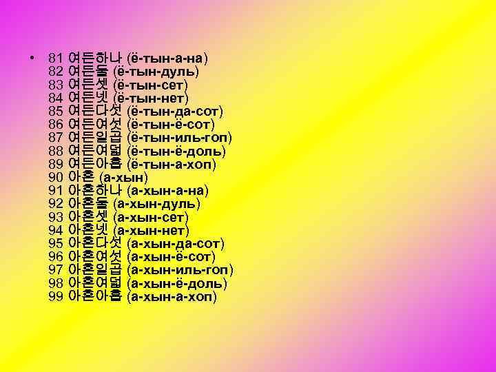 • 81 여든하나 (ё-тын-а-на) 82 여든둘 (ё-тын-дуль) 83 여든셋 (ё-тын-сет) 84 여든넷 (ё-тын-нет) 85 여든다섯 (ё-тын-да-сот) 86 여든여섯 (ё-тын-ё-сот) 87 여든일곱 (ё-тын-иль-гоп) 88 여든여덟 (ё-тын-ё-доль) 89 여든아홉 (ё-тын-а-хоп) 90 아흔 (а-хын) 91 아흔하나 (а-хын-а-на) 92 아흔둘 (а-хын-дуль) 93 아흔셋 (а-хын-сет) 94 아흔넷 (а-хын-нет) 95 아흔다섯 (а-хын-да-сот) 96 아흔여섯 (а-хын-ё-сот) 97 아흔일곱 (а-хын-иль-гоп) 98 아흔여덟 (а-хын-ё-доль) 99 아흔아홉 (а-хын-а-хоп)