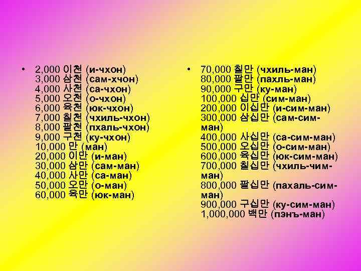 • 2, 000 이천 (и-чхон) 3, 000 삼천 (сам-хчон) 4, 000 사천 (са-чхон) 5, 000 오천 (о-чхон) 6, 000 육천 (юк-чхон) 7, 000 칠천 (чхиль-чхон) 8, 000 팔천 (пхаль-чхон) 9, 000 구천 (ку-чхон) 10, 000 만 (ман) 20, 000 이만 (и-ман) 30, 000 삼만 (сам-ман) 40, 000 사만 (са-ман) 50, 000 오만 (о-ман) 60, 000 육만 (юк-ман) • 70, 000 칠만 (чхиль-ман) 80, 000 팔만 (пахль-ман) 90, 000 구만 (ку-ман) 100, 000 십만 (сим-ман) 200, 000 이십만 (и-сим-ман) 300, 000 삼십만 (сам-симман) 400, 000 사십만 (са-сим-ман) 500, 000 오십만 (о-сим-ман) 600, 000 육십만 (юк-сим-ман) 700, 000 칠십만 (чхиль-чимман) 800, 000 팔십만 (пахаль-симман) 900, 000 구십만 (ку-сим-ман) 1, 000 백만 (пэнъ-ман)
