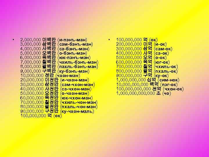 • 2, 000 이백만 (и-пэнъ-ман) 3, 000 삼백만 (сам-бэнъ-ман) 4, 000 사백만 (са-бэнъ-ман) 5, 000 오백만 (о-бэнъ-ман) 6, 000 육백만 (юк-пэнъ-ман) 7, 000 칠백만 (чхиль-бэнъ-ман) 8, 000 팔백만 (пахль-бэнъ-ман) 9, 000 구백만 (ку-бэнъ-ман) 10, 000 천만 (чхон-ман) 20, 000 이천만 (и-чхон-ман) 30, 000 삼천만 (сам-чхон-ман) 40, 000 사천만 (са-чхон-ман) 50, 000 오천만 (о-чхон-ман) 60, 000 육천만 (юк-чхон-ман) 70, 000 칠천만 (чхиль-чон-ман) 80, 000 팔천만 (пхаль-чон-ман) 90, 000 구천만 (ку-чхон-маль) 100, 000 억 (ок) • 100, 000 억 (ок) 200, 000 이억 (и-ок) 300, 000 삼억 (сам-ок) 400, 000 사억 (са-ок) 500, 000 오억 (о-ок) 600, 000 육억 (юг-ок) 700, 000 칠억 (чхиль-ок) 800, 000 팔억 (пхаль-ок) 900, 000 구억 (ку-ок) 1, 000, 000 십억 (сим-нок) 10, 000, 000 백억 (пэг-ок) 100, 000, 000 천억 (чхон-ок) 1, 000, 000 조 (чо)