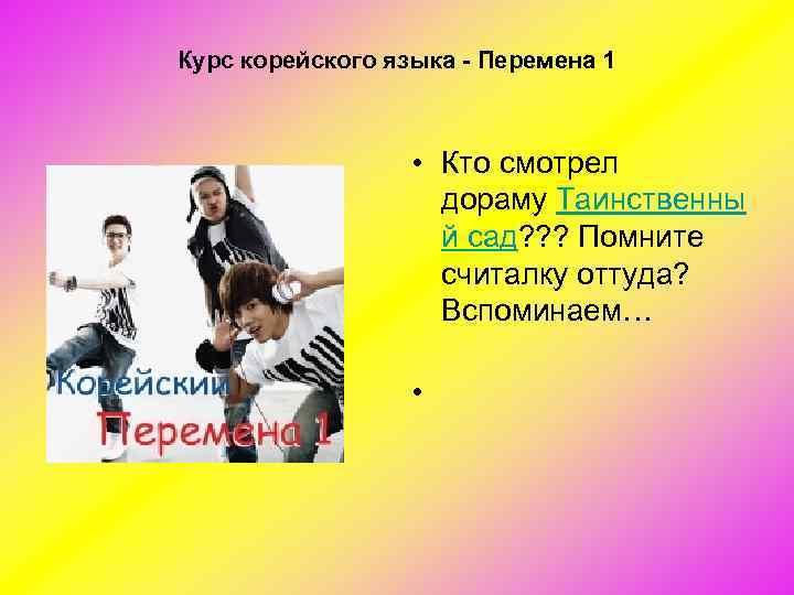 Курс корейского языка - Перемена 1 • Кто смотрел дораму Таинственны й сад? ? ? Помните считалку оттуда? Вспоминаем… •