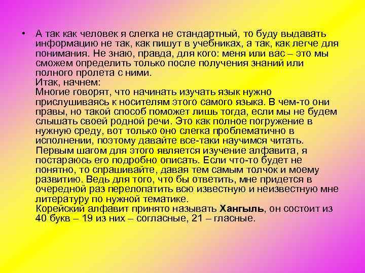 • А так как человек я слегка не стандартный, то буду выдавать информацию не так, как пишут в учебниках, а так, как легче для понимания. Не знаю, правда, для кого: меня или вас – это мы сможем определить только после получения знаний или полного пролета с ними. Итак, начнем: Многие говорят, что начинать изучать язык нужно прислушиваясь к носителям этого самого языка. В чем то они правы, но такой способ поможет лишь тогда, если мы не будем слышать своей родной речи. Это как полное погружение в нужную среду, вот только оно слегка проблематично в исполнении, поэтому давайте все таки научимся читать. Первым шагом для этого является изучение алфавита, я постараюсь его подробно описать. Если что то будет не понятно, то спрашивайте, давая тем самым толчок и моему развитию. Ведь для того, что бы ответить, мне придется в очередной раз перелопатить всю известную и неизвестную мне литературу по нужной тематике. Корейский алфавит принято называть Хангыль, он состоит из 40 букв – 19 из них – согласные, 21 – гласные.