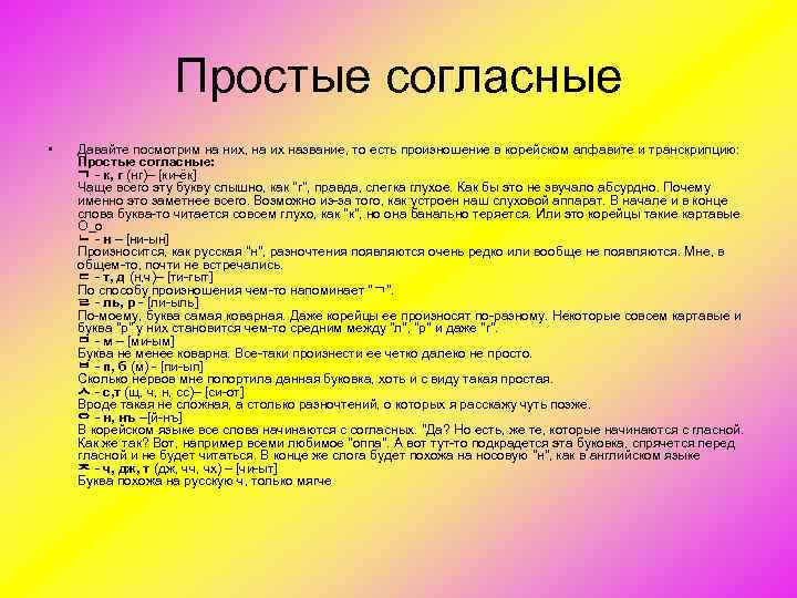 Простые согласные • Давайте посмотрим на них, на их название, то есть произношение в корейском алфавите и транскрипцию: Простые согласные: ᆨ к, г (нг)– [ки ёк] Чаще всего эту букву слышно, как "г", правда, слегка глухое. Как бы это не звучало абсурдно. Почему именно это заметнее всего. Возможно из за того, как устроен наш слуховой аппарат. В начале и в конце слова буква то читается совсем глухо, как "к", но она банально теряется. Или это корейцы такие картавые О_о ᆫ н – [ни ын] Произносится, как русская "н", разночтения появляются очень редко или вообще не появляются. Мне, в общем то, почти не встречались. ᆮ т, д (н, ч)– [ти гыт] По способу произношения чем то напоминает "ᆨ". ᆯ ль, р [ли ыль] По моему, буква самая коварная. Даже корейцы ее произносят по разному. Некоторые совсем картавые и буква "р" у них становится чем то средним между "л", "р" и даже "г". ᆷ м – [ми ым] Буква не менее коварна. Все таки произнести ее четко далеко не просто. ᆸ п, б (м) [пи ып] Сколько нервов мне попортила данная буковка, хоть и с виду такая простая. ᄉ с, т (щ, ч, н, сс)– [си от] Вроде такая не сложная, а столько разночтений, о которых я расскажу чуть позже. ᄋ н, нъ –[й нъ] В корейском языке все слова начинаются с согласных. "Да? Но есть, же те, которые начинаются с гласной. Как же так? Вот, например всеми любимое "оппа". А вот тут то подкрадется эта буковка, спрячется перед гласной и не будет читаться. В конце же слога будет похожа на носовую "н", как в английском языке ᄌ ч, дж, т (дж, чч, чх) – [чи ыт] Буква похожа на русскую ч, только мягче