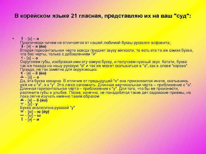 В корейском языке 21 гласная, представляю их на ваш "суд": • ᅡ [а] – а Практически ничем не отличается от нашей любимой буквы русского алфавита; ᅣ [я] – я (йа) Вторая горизонтальная черта всегда придает звуку мягкости, то есть это та же самая буква, что без черты, только с добавлением "й" ᅥ [o] – о Округляем губы, изображая ими эту самую букву, и получаем нужный звук. Кстати, буква так же похода на нашу русскую "о" и так же может скатываться в "а", как в слове "корова". Правда, не так заметно для окружающих ᅧ [е] – ё (йо) ᅩ [о] – о Да, эта буква коварна. В отличие от предыдущей "о" она произносится иначе, скатываясь уже не к "а", а к "у". Это легко запомнить. Длинная вертикальная черта – приближение к "а". Длинная горизонтальная черта – приближение к "у". Для того, что бы ее произнести, растяните губы в улыбке. Позже, конечно, не понадобятся такие дет. садовские приемы, но пока легче изучать именно таким образом ᅭ [е] – ё (йо) ᅮ [у] у Буква аналогична русской "у" ᅲ [ю] – ю (йу) ᅳ [ы] – ы ᅵ [и] – и
