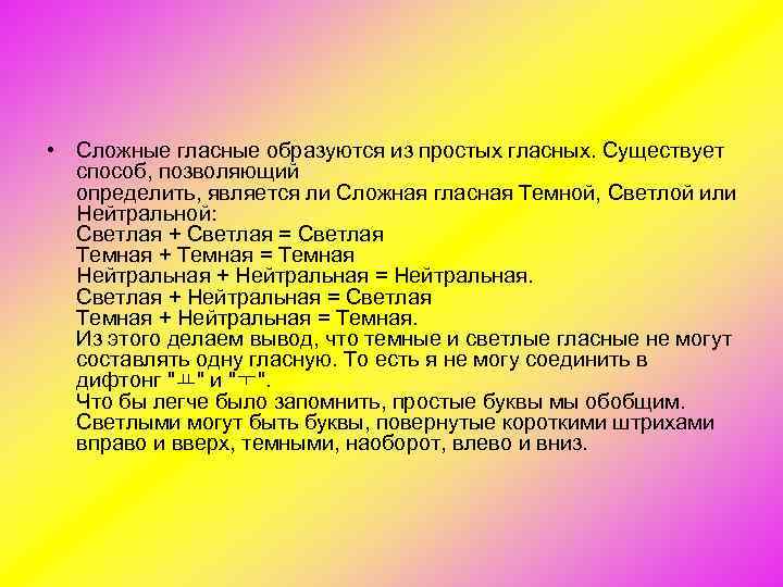 • Сложные гласные образуются из простых гласных. Существует способ, позволяющий определить, является ли Сложная гласная Темной, Светлой или Нейтральной: Светлая + Светлая = Светлая Темная + Темная = Темная Нейтральная + Нейтральная = Нейтральная. Светлая + Нейтральная = Светлая Темная + Нейтральная = Темная. Из этого делаем вывод, что темные и светлые гласные не могут составлять одну гласную. То есть я не могу соединить в дифтонг "ᅭ" и "ᅮ". Что бы легче было запомнить, простые буквы мы обобщим. Светлыми могут быть буквы, повернутые короткими штрихами вправо и вверх, темными, наоборот, влево и вниз.