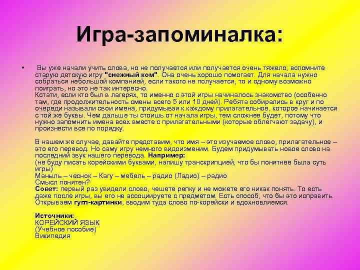 Игра-запоминалка: • Вы уже начали учить слова, но не получается или получается очень тяжело, вспомните старую детскую игру "снежный ком". Она очень хорошо помогает. Для начала нужно собраться небольшой компанией, если такого не получается, то и одному возможно поиграть, но это не так интересно. Кстати, если кто был в лагерях, то именно с этой игры начиналось знакомство (особенно там, где продолжительность смены всего 5 или 10 дней). Ребята собирались в круг и по очереди называли свои имена, придумывая к каждому прилагательное, которое начинается с той же буквы. Чем дальше ты стоишь от начала игры, тем сложнее будет, потому что нужно запомнить имена всех вместе с прилагательными (которые облегчают задачу), и произнести все по порядку. В нашем же случае, давайте представим, что имя – это изучаемое слово, прилагательное – это его перевод. Но саму игру немного видоизменим. Будем придумывать новое слово на последний звук нашего перевода. Например: (не буду писать корейскими буквами, напишу транскрипцией, что бы понятнее была суть игры) Маныль – чеснок – Кагу – мебель – радио (Ладио) – радио Смысл понятен? Совет: первый раз увидели слово, чешете репку и не можете его никак понять. То есть даже после игры, вы его не ассоциируете с предметом. Есть способ, что бы это исправить. Открываем гугл-картинки, вводим туда слово по корейски и вдохновляемся. Источники: КОРЕЙСКИЙ ЯЗЫК (Учебное пособие) Википедия