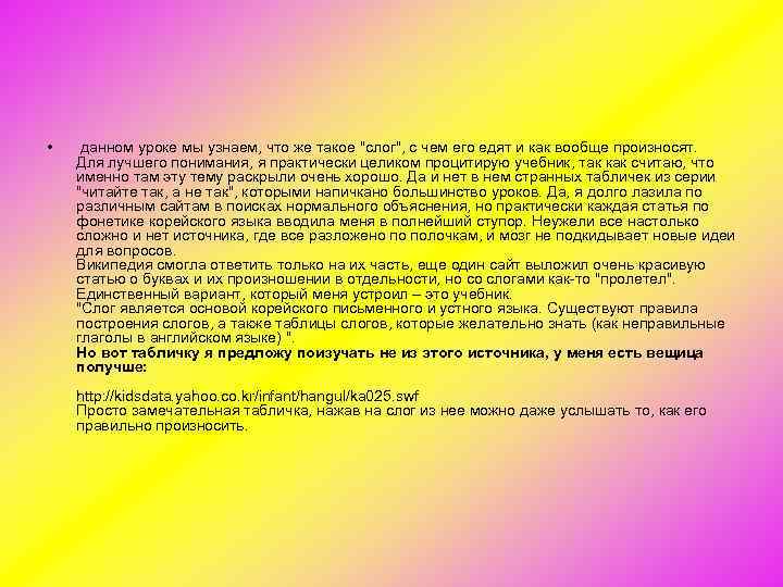 • данном уроке мы узнаем, что же такое "слог", с чем его едят и как вообще произносят. Для лучшего понимания, я практически целиком процитирую учебник, так как считаю, что именно там эту тему раскрыли очень хорошо. Да и нет в нем странных табличек из серии "читайте так, а не так", которыми напичкано большинство уроков. Да, я долго лазила по различным сайтам в поисках нормального объяснения, но практически каждая статья по фонетике корейского языка вводила меня в полнейший ступор. Неужели все настолько сложно и нет источника, где все разложено по полочкам, и мозг не подкидывает новые идеи для вопросов. Википедия смогла ответить только на их часть, еще один сайт выложил очень красивую статью о буквах и их произношении в отдельности, но со слогами как то "пролетел". Единственный вариант, который меня устроил – это учебник. "Слог является основой корейского письменного и устного языка. Существуют правила построения слогов, а также таблицы слогов, которые желательно знать (как неправильные глаголы в английском языке) ". Но вот табличку я предложу поизучать не из этого источника, у меня есть вещица получше: http: //kidsdata. yahoo. co. kr/infant/hangul/ka 025. swf Просто замечательная табличка, нажав на слог из нее можно даже услышать то, как его правильно произносить.
