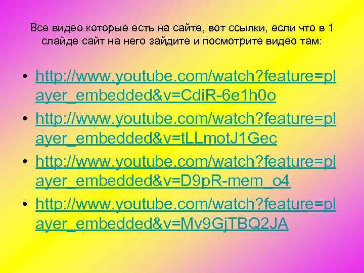 Все видео которые есть на сайте, вот ссылки, если что в 1 слайде сайт на него зайдите и посмотрите видео там: • http: //www. youtube. com/watch? feature=pl ayer_embedded&v=Cdi. R 6 e 1 h 0 o • http: //www. youtube. com/watch? feature=pl ayer_embedded&v=t. LLmot. J 1 Gec • http: //www. youtube. com/watch? feature=pl ayer_embedded&v=D 9 p. R mem_o 4 • http: //www. youtube. com/watch? feature=pl ayer_embedded&v=Mv 9 Gj. TBQ 2 JA