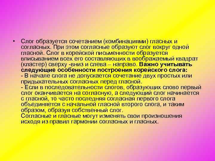 • Слог образуется сочетанием (комбинациями) гласных и согласных. При этом согласные образуют слог вокруг одной гласной. Слог в корейской письменности образуется вписыванием всех его составляющих в воображаемый квадрат (кластер) сверху вниз и слева – направо. Важно учитывать следующие особенности построения корейского слога: В начале слога не допускается сочетание двух простых или придыхательных согласных перед гласной. Если в последовательности слогов, образующих слово первый слог оканчивается на согласную, а следующий слог начинается с гласной, то часто последняя согласная первого слога объединяется с начальной гласной второго слога, и таким образом, образуя собственный слог. Согласные и гласные могут изменять свои произношения исходя из правил гармонии согласных и гласных.