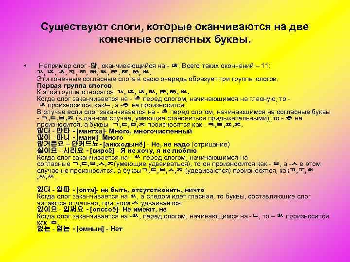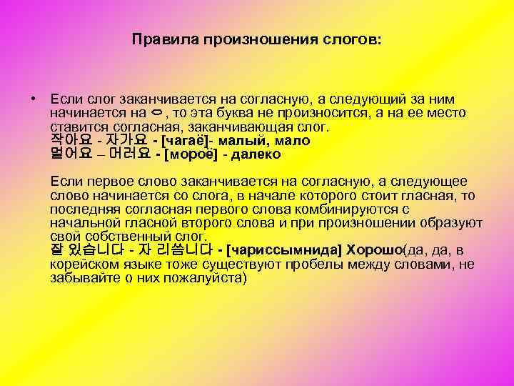 Правила произношения слогов: • Если слог заканчивается на согласную, а следующий за ним начинается на ᄋ, то эта буква не произносится, а на ее место ставится согласная, заканчивающая слог. 작아요 자가요 - [чагаё] малый, мало 멀어요 – 머러요 - [мороё] далеко Если первое слово заканчивается на согласную, а следующее слово начинается со слога, в начале которого стоит гласная, то последняя согласная первого слова комбинируются с начальной гласной второго слова и произношении образуют свой собственный слог. 잘 있습니다 자 리씀니다 - [чариссымнида] Хорошо(да, в корейском языке тоже существуют пробелы между словами, не забывайте о них пожалуйста)