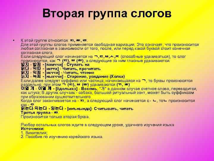 Вторая группа слогов • К этой группе относятся: ᆰ, ᆲ, ᆵ. Для этой группы слогов применяется свободная вариация. Это означает, что произносится любая согласная в зависимости от того, после, или перед какой буквой стоит конечная согласная слога. Если следующий слог начинается на ᆨ, ᆮ, ᆸ, ᄉ, ᄌ (способные удваиваться), то слог произносится, как ᆨ (ᆰ), ᆸ (ᆲ), а следующие за ним гласные удваиваются. 밟지 밥찌 - [памччи] Ступать на 읽다 익따 - [иктта] Читать, прочитать 읽지 익찌 - [икччи] Читать, чтение 늙지 늑찌 - [ныкччи] Старение, увядание (Холка) Если далее следует суффикс или частица, начинающаяся на ᆨ, то буквы произносятся раздельно, при этом ᆨ (ᆰ), ᆸ (ᆲ) удваиваются (ᆩ, ㅃ) 여덟 개 여덜 깨 - [ёдольккэ] Восемь, "개" в данном случае счетное слово, переводится, как штука; В других случаях собака, большой ритуальный зонт, может быть суффиксом при образовании существительного. Когда слог заканчивается на ᆰ, а следующий слог начинается с ᆫ, тоᆫ произносится как ᄋ 읽는다 익는다 - 잉는다 - [инънында] Считывать, читать Третья группа ᆱ. Произносится только вторая буква. Разбор остальных слогов ждите в следующем уроке, удачного изучения языка Источники: 1. Википелия; 2. Пособие по изучению корейского языка.