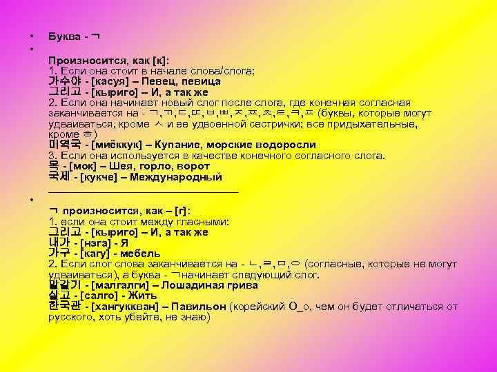 • • • Буква - ᆨ Произносится, как [к]: 1. Если она стоит в начале слова/слога: 가수야 - [касуя] – Певец, певица 그리고 - [кыриго] – И, а так же 2. Если она начинает новый слог после слога, где конечная согласная заканчивается на ᆨ, ᆩ, ᆮ, ㄸ, ᆸ, ㅃ, ᄌ, ᄍ, ᄎ, ᄐ, ᄏ, ᄑ (буквы, которые могут удваиваться, кроме ᄉ и ее удвоенной сестрички; все придыхательные, кроме ᄒ) 미역국 - [миёккук] – Купание, морские водоросли 3. Если она используется в качестве конечного согласного слога. 목 - [мок] – Шея, горло, ворот 국제 - [кукче] – Международный ________________ ᆨ произносится, как – [г]: 1. если она стоит между гласными: 그리고 - [кыриго] – И, а так же 내가 - [нэга] - Я 가구 - [кагу] - мебель 2. Если слог слова заканчивается на ᆫ, ᆯ, ᆷ, ᄋ (согласные, которые не могут удваиваться), а буква ᆨначинает следующий слог. 말갈기 - [малгалги] – Лошадиная грива 살고 - [салго] - Жить 한국관 - [хангуккван] – Павильон (корейский О_о, чем он будет отличаться от русского, хоть убейте, не знаю)