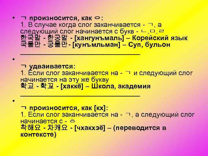 • ᆨ произносится, как ᄋ: 1. В случае когда слог заканчивается ᆨ, а следующий слог начинается с букв ᆫ, ᆷ, ᆯ 한국말 - 한궁말 - [хангунъмаль] – Корейский язык 국물만 - 궁물만- [кунъмльман] – Суп, бульон ________________ • ᆨ удваивается: 1. Если слог заканчивается на ᆨ и следующий слог начинается на эту же букву 학교 - 학꾜 - [хаккё] – Школа, академия ________________ • ᆨ произносится, как [кх]: 1. Если слог заканчивается на ᆨ, а следующий слог начинается с ᄒ 착해요 - 차캐요 - [чхакхэё] – (переводится в контексте)