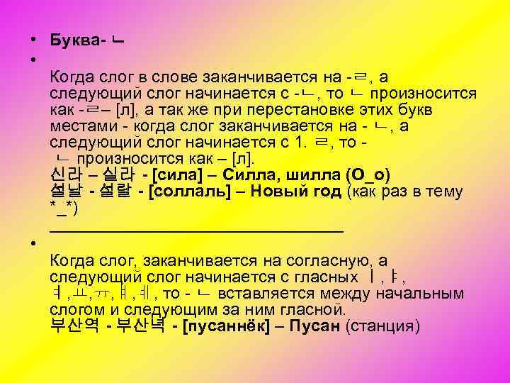 • Буква- ᆫ • Когда слог в слове заканчивается на ᆯ, а следующий слог начинается с ᆫ, то ᆫ произносится как ᆯ– [л], а так же при перестановке этих букв местами когда слог заканчивается на ᆫ, а следующий слог начинается с 1. ᆯ, то ᆫ произносится как – [л]. 신라 – 실라 - [сила] – Силла, шилла (О_о) 설날 - 설랄 - [соллаль] – Новый год (как раз в тему *_*) ________________ • Когда слог, заканчивается на согласную, а следующий слог начинается с гласных ᅵ, ᅣ, ᅧ, ᅭ, ᅲ, ᅤ, ᅨ, то ᆫ вставляется между начальным слогом и следующим за ним гласной. 부산역 - 부산녁 - [пусаннёк] – Пусан (станция)