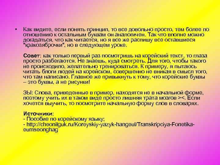 • Как видите, если понять принцип, то все довольно просто, тем более по отношению к остальным буквам он аналогичен. Так что вполне можно догадаться, что как читается, но я все же распишу все оставшиеся "кракозяброчки", но в следующем уроке. Совет: как только первый раз посмотришь на корейский текст, то глаза просто разбегаются. Не знаешь, куда смотреть. Для того, чтобы такого не происходило, желательно тренироваться. К примеру, я пытаюсь читать блоги людей на корейском, совершенно не вникая в смысл того, что там написано. Главное же привыкнуть к тому, что корейские буквы – это буквы, а не рисунки! ЗЫ: Слова, приведенные в пример, находятся не в начальной форме, поэтому учить их в таком виде просто лишняя трата мозгов ><. Если хочется выучить, то посмотрите начальную форму слов в словарях. Источники: Пособие по корейскому языку; http: //cheonilguk. ru/Koreyskiy yazyk hangeul/Transkripciya Fonetika eumseonghag
