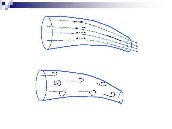 7. Ламинарное и турбулентное течение. Число Рейнольдса. n n Течение называется ламинарным (слоистым), если вдоль потока каждый выделенный тонкий слой скользит относительно соседних, не перемешиваясь с ними. Течение называется турбулентным (вихревым), если частицы жидкости переходят из слоя в слой. Это сопровождается интенсивным перемешиванием жидкости и вихреобразованием.