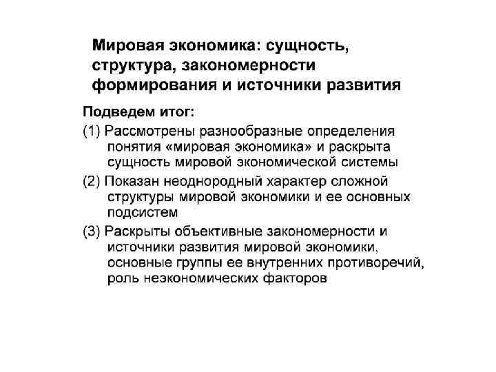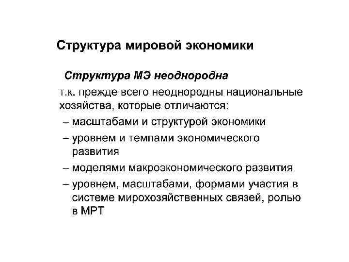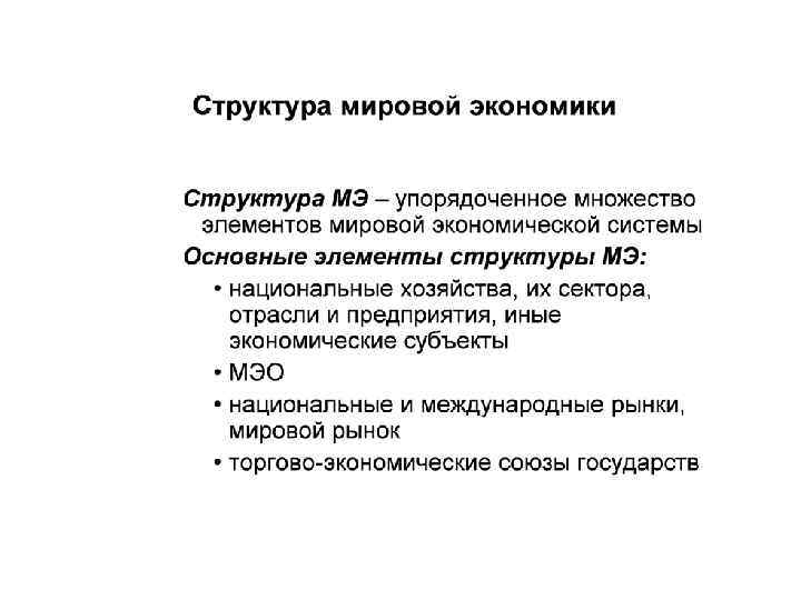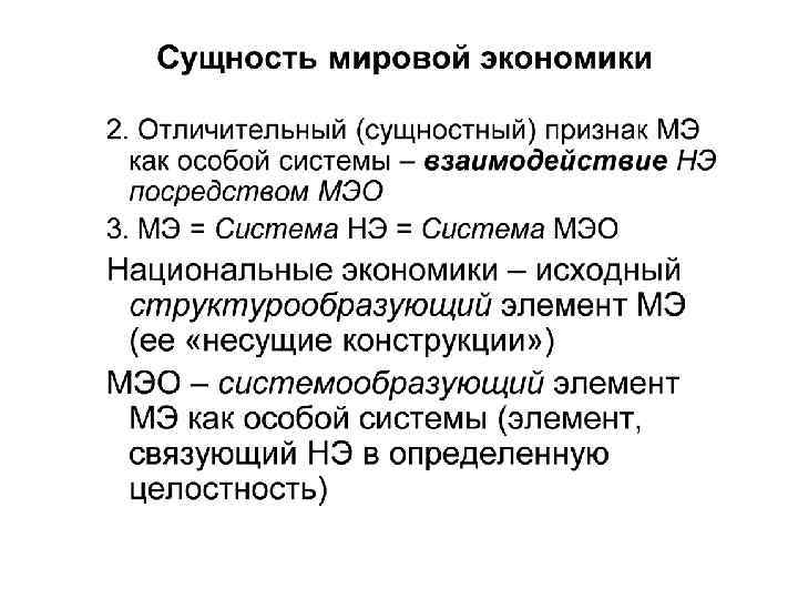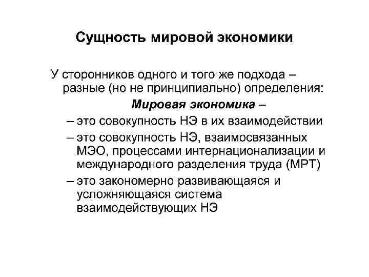 Различные определения МЭО • МЭО – система разнообразных хозяйственных (научно-технических, производственных, коммерческих, валютно-финансовых и кредитноденежных связей национальных экономик различных стран, основанная на МРТ)