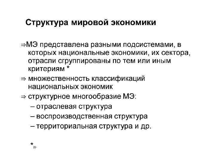 • Мезоуровень составляют сложные подсистемы, входящие в национальные экономики, например, отрасли, и экономические регионы
