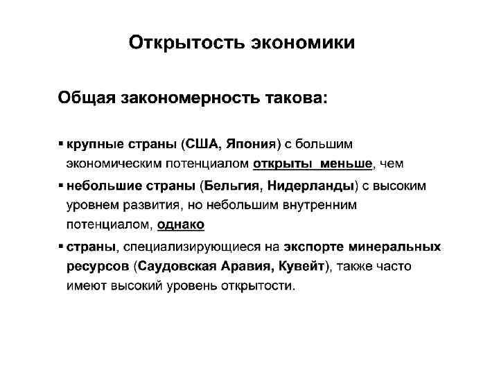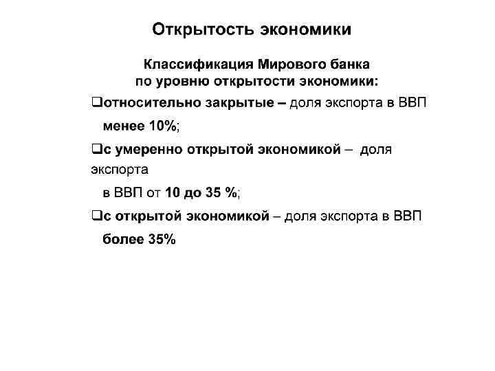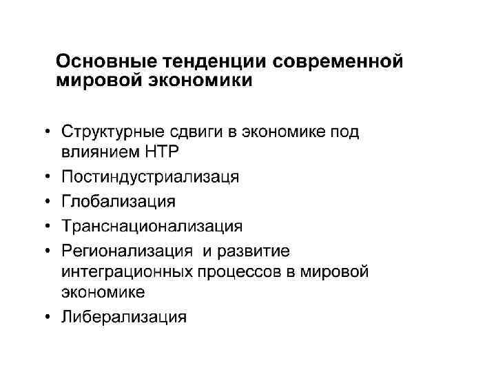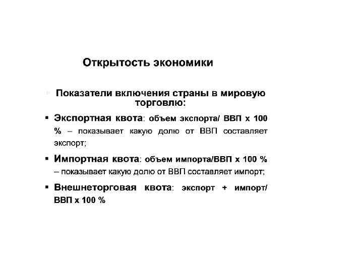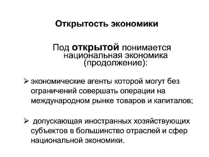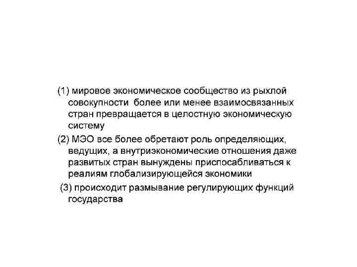 Факторы, влияющие на усиление роли МЭО на современном этапе • Рыночные методы хозяйствования получают всеобщее распространение, тогда как зона нерыночной экономики сжимается. Уменьшается характерная для нее тенденция к закрытости и автаркии (самообеспечению) • Открытость национальных экономик увеличивается также благодаря либерализации МЭО. Расширяются возможности свободного передвижения товаров, капиталов, рабочей силы, технологий. • Международная региональная интеграция приближает страны к единому экономическому пространству.