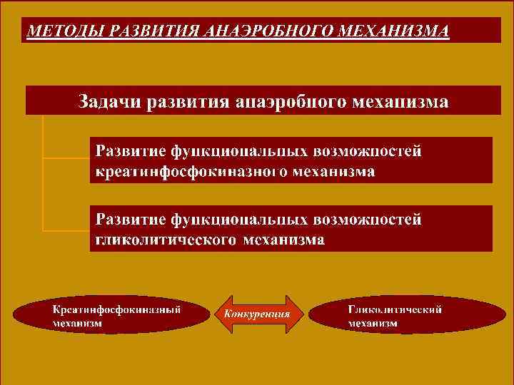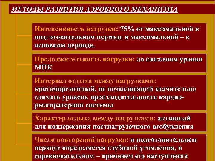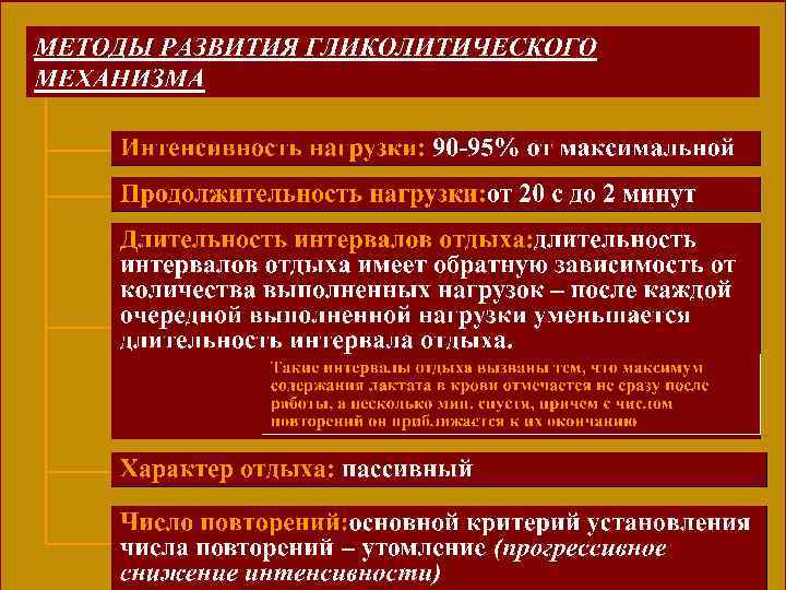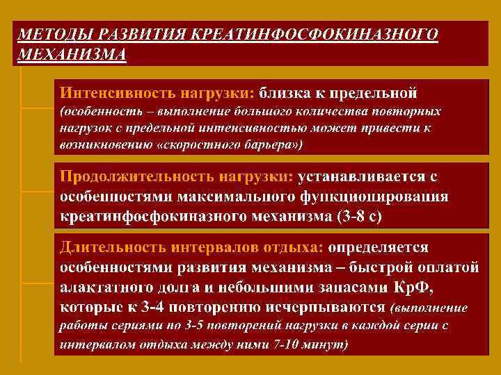 МЕХАНИЗМЫ ЭНЕРГООБЕСПЕЧЕНИЯ МЕХАНИЗМЫ ЭНЕРГЕТИЧЕСКОГО ОБЕСПЕЧЕНИЯ НАГРУЗКИ анаэробный энергетический механизм без образования лактата: креатинфосфат (КФ) + аденозиндифосфат (АДФ) - креатин + АТФ анаэробный энергетический механизм с образованием лактата: глюкоза + АДФ - лактат + АТФ (гликолиз) аэробный энергетический механизм без образования лактата: глюкоза + кислород + АДФ - вода + углекислота (С 02) + АТФ. аэробный энергетический путь без образования лактата: жиры + кислород + АДФ - вода + углекислота (С 02) + АТФ