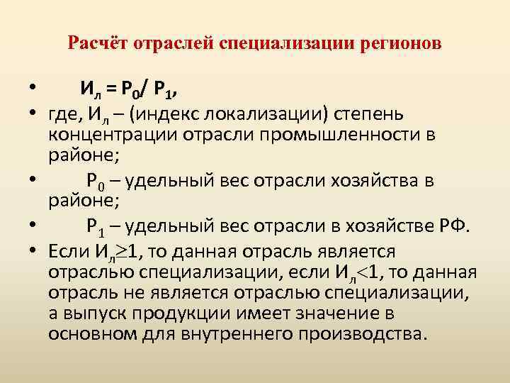 Расчёт отраслей специализации регионов • И л = Р 0 / Р 1 , • где, Ил – (индекс локализации) степень концентрации отрасли промышленности в районе; • Р 0 – удельный вес отрасли хозяйства в районе; • Р 1 – удельный вес отрасли в хозяйстве РФ. • Если Ил 1, то данная отрасль является отраслью специализации, если Ил 1, то данная отрасль не является отраслью специализации, а выпуск продукции имеет значение в основном для внутреннего производства.