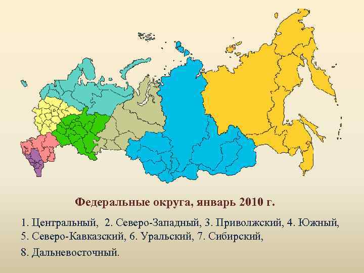 Федеральные округа, январь 2010 г. 1. Центральный, 2. Северо-Западный, 3. Приволжский, 4. Южный, 5. Северо-Кавказский, 6. Уральский, 7. Сибирский, 8. Дальневосточный.
