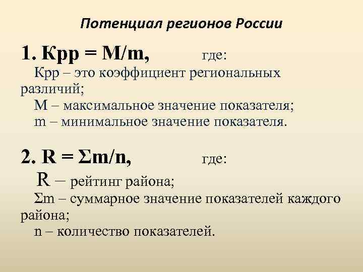 Потенциал регионов России 1. Крр = M/m, где: Крр – это коэффициент региональных различий; М – максимальное значение показателя; m – минимальное значение показателя. 2. R = Ʃm/n, R – рейтинг района; где: Ʃm – суммарное значение показателей каждого района; n – количество показателей.