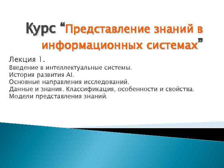 Курс “Представление знаний в информационных системах” Лекция 1. Введение в интеллектуальные системы. История развития AI. Основные направления исследований. Данные и знания. Классификация, особенности и свойства. Модели представления знаний.