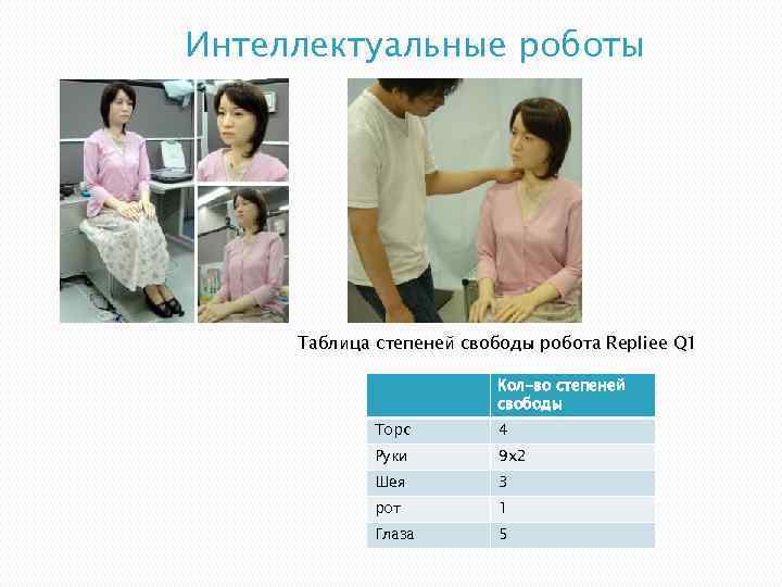 Интеллектуальные роботы Таблица степеней свободы робота Repliee Q 1 Кол-во степеней свободы Торс 4 Руки 9 x 2 Шея 3 рот 1 Глаза 5