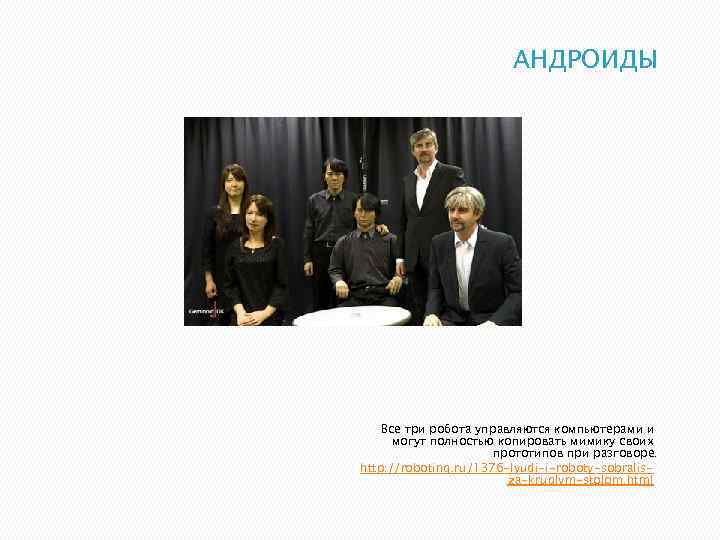 АНДРОИДЫ Все три робота управляются компьютерами и могут полностью копировать мимику своих прототипов при разговоре. http: //roboting. ru/1376 -lyudi-i-roboty-sobralisza-kruglym-stolom. html