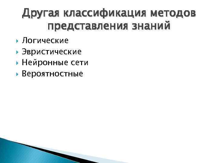 Другая классификация методов представления знаний Логические Эвристические Нейронные сети Вероятностные