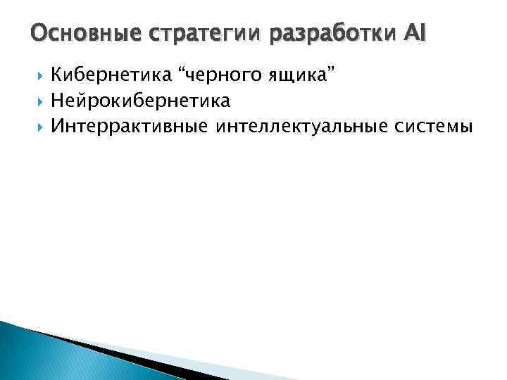 Основные стратегии разработки AI Кибернетика “черного ящика” Нейрокибернетика Интеррактивные интеллектуальные системы