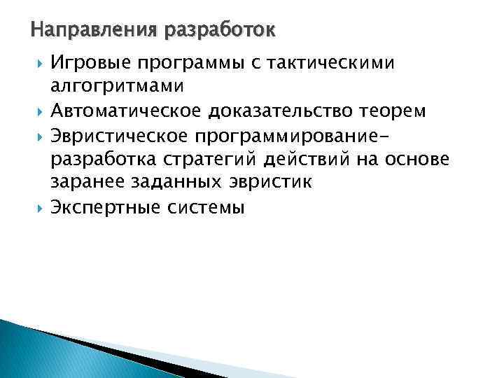 Направления разработок Игровые программы с тактическими алгогритмами Автоматическое доказательство теорем Эвристическое программированиеразработка стратегий действий на основе заранее заданных эвристик Экспертные системы