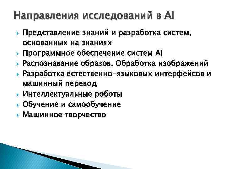Направления исследований в AI Представление знаний и разработка систем, основанных на знаниях Программное обеспечение систем AI Распознавание образов. Обработка изображений Разработка естественно-языковых интерфейсов и машинный перевод Интеллектуальные роботы Обучение и самообучение Машинное творчество