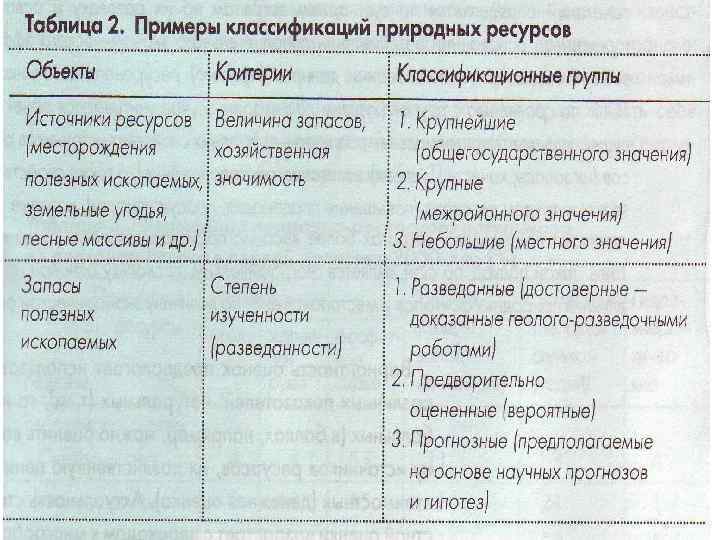 Природная (генетическая) классификация • Природная (генетическая) классификация — классификация по природным группам по признаку принадлежности к тому или иному компоненту природы: • минеральные (полезные ископаемые), • водные, • земельные (в том числе почвенные), • биологические (растительные (том числе лесные) и животного мира, • климатические ресурсы • энергии природных процессов (солнечное излучение, внутреннее тепло Земли, энергия ветра и т. п. ).