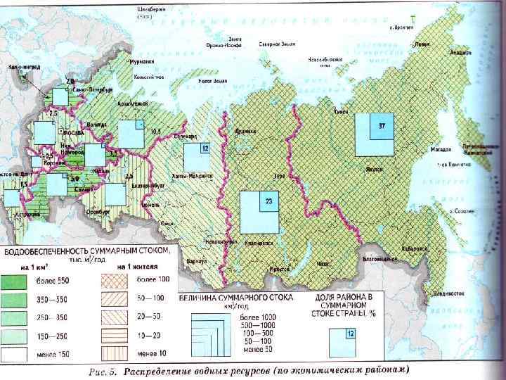 Распределение водных ресурсов по территории. • Водные ресурсы неравномерно распределены по территории страны (см. табл. 2). 65% объёма речного стока приходится на Восточно Сибирский и Дальневосточный районы. По удельным показателям Северный р н занимает 1 е место но суммарному и поверхностному стоку, а Северо Западный по подземному. По ресурсам почвенной влаги выделяются Северо Кавказский и Центральный районы. Наименьшими удельными ресурсами суммарного и подземного стока располагают Поволжский и Центральночернозёмный, а ресурсами почвенной влаги — Восточно Сибирский и Дальневосточный районы. На каждого жителя Дальнего Востока в год приходится 210 тыс. м 3 местного речного стока, а в Поволжье лишь 1, 9 тыс. м 3. Ещё более контрастна ситуация с обеспеченностью водными ресурсами для отдельных субъектов РФ.